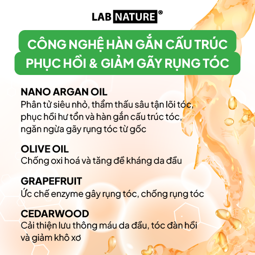 - Nano Dầu Argan: thẩm thấu sâu vào lõi tóc, phục hồi cấu trúc tóc hư tổn, ngăn ngừa gãy rụng tóc từ gốc.