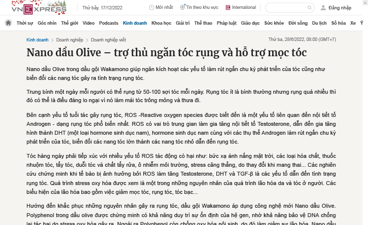 Ngày 28/6/2022, VnExpress đưa tin hoạt chất Nano Dầu Olive có trong dầu gội WAKAMONO giúp giảm gốc tự do oxi hóa ROS vượt trội – nguyên nhân chính gây rụng tóc.