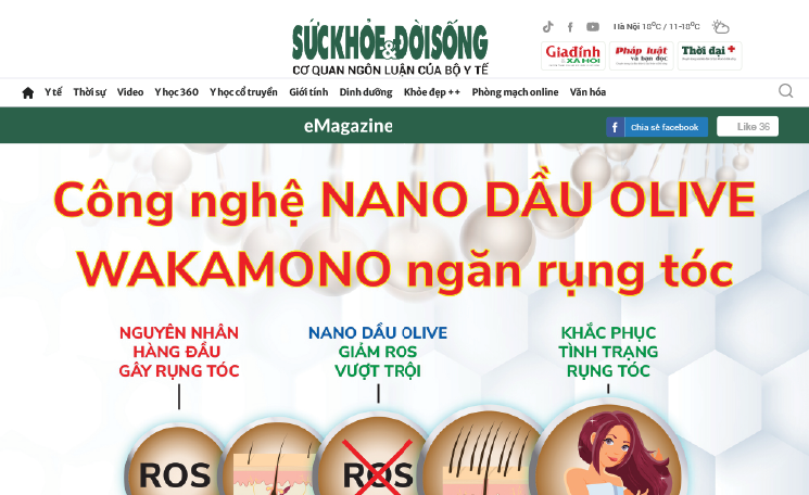 Báo Sức khỏe và Đời sống – cơ quan ngôn luận của Bộ Y tế đưa tin về công nghệ Nano Dầu Olive ngăn rụng tóc với đầy đủ các nghiên cứu và chứng minh khoa học uy tín.